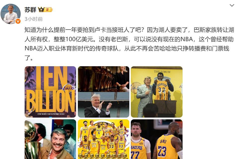 对此,国内媒体人“苏群”社媒发文谈到了巴斯家族出售股权一事,他表示知道为什么提前一年要抢到东契奇当接班人了吧?因为湖人要卖了。