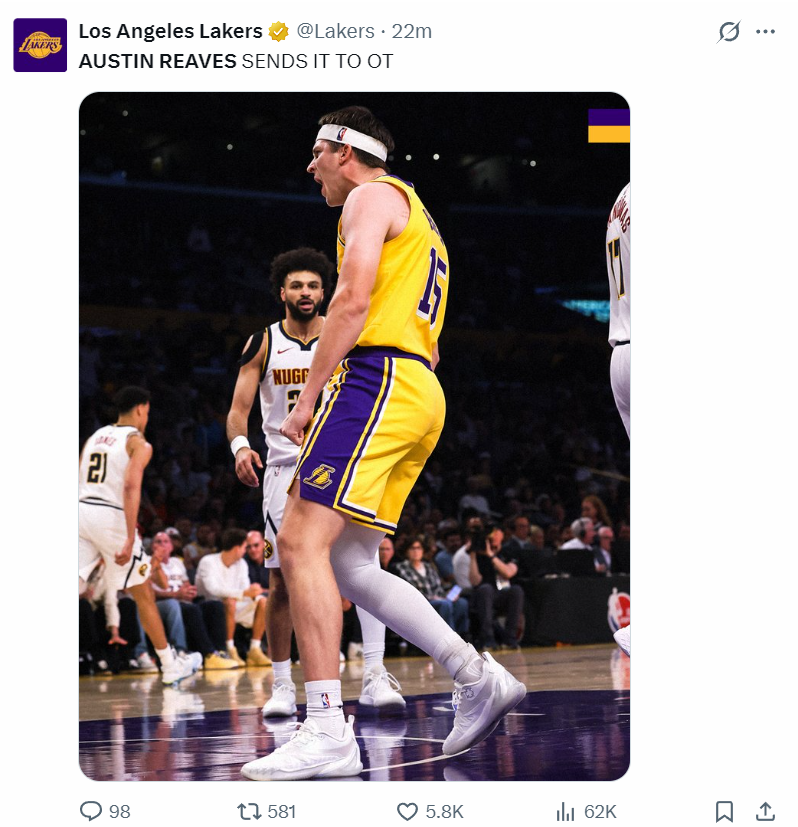 湖人官方也盛赞里夫斯帮助球队拖入了加时赛。