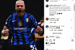 国米球员迪马尔科社媒晒出激情庆祝的照片,并配文:“无论还剩多少时间,雨下得多大,对手是谁。在圣西罗,身穿这件球衣,没有什么是不可能的!嗨,伟大的家伙们!”